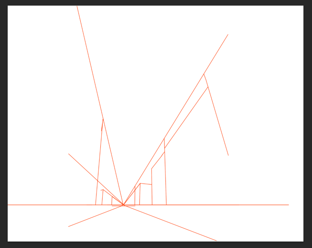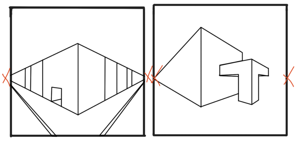One point perspective refers to images with only one vanishing point on the horizon line (in this case marked with a red X), points at which receding parallel lines viewed in perspective appear to converge.