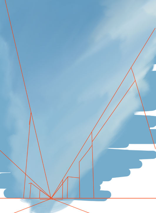 I began my piece by establishing a horizon line and then sketching some shapes, I had the idea of drawing a street with the focus point laying on the bottom left third of the image. I started painting in the sky, as I felt it would help me establish the overall mood of the painting, at this point I didn’t really know what to put at the focus of my painting so I left it out of the sketch.