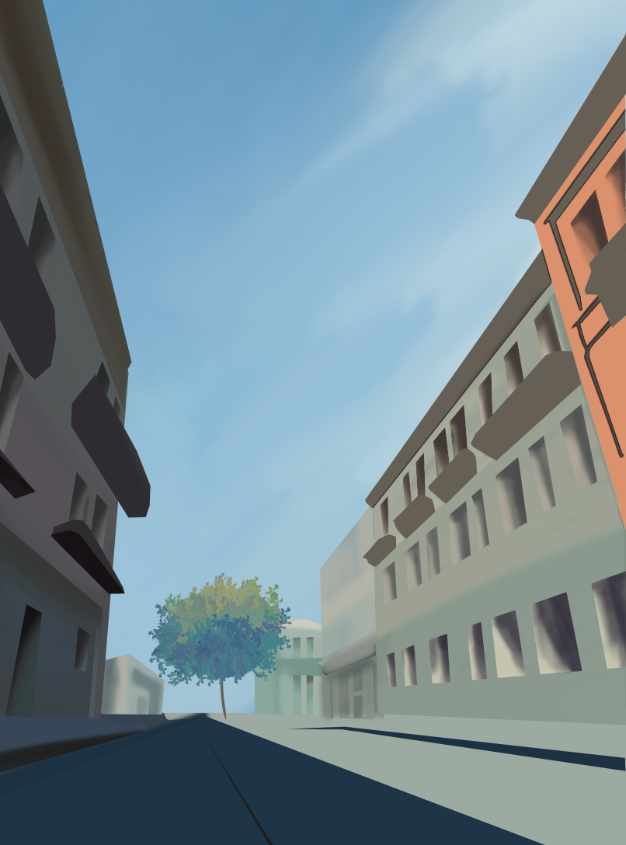 I continued blocking in colour within the shapes to establish some buildings on a street, I then moved on to adding in detail into the scene. I wasn’t quite sure what style I wanted to paint in so I tried a sketchy cartoon-like style as well as a slightly more realistic hard-edged style.