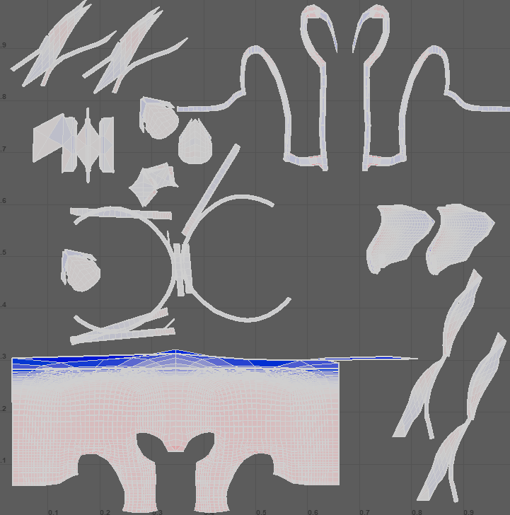 Despite struggling with the more complex shapes I still ensured there would be no obvious seams in the meshes, no overlap between different textures, as little deformation as possible and I checked that my texel density was consistent across all of the uvs.
