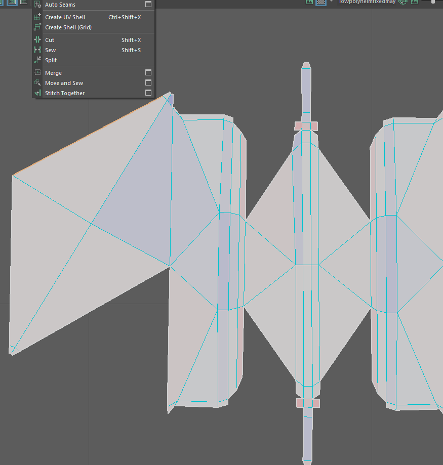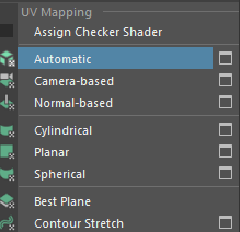 For this reason I stuck to mostly using the preset uv unwrap options for some of the more complex meshes in my asset. These options are provided by maya as a quick fix or base templates off of which modifications are later made to better suit the mesh. For the simpler shapes I used the ‘Automatic’ unwrap followed by sewing the edges together in a way which would ensure any texture I placed on it would correctly wrap around the mesh.